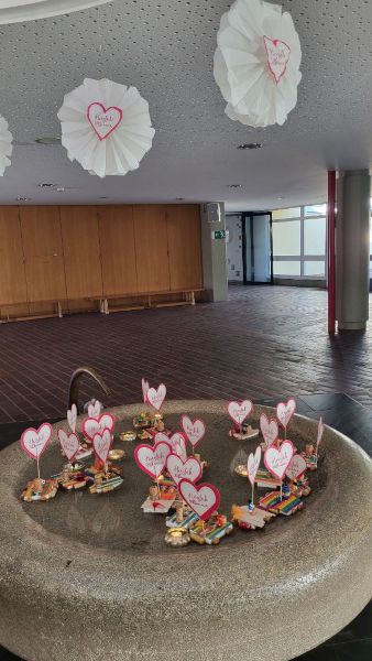 Eine Mutter bastelte mit uns Chamäleons aus Eierkartons. Eine andere Mutter und Frau Thiel marmorierten mit uns Papier, die wir für eine Mappe brauchten. Eine dritte Mutter machte mit uns Armbänder. Mit der vierten Mutter von Toni bastelten wir Bügelperlenvögel und mit der fünften Mutter bemalten wir einen Rahmen, in dem wir ein hängendes Herz aus Wolle befestigten. Wir haben das Kleben der marmorierten Blätter auf die Mappe nicht ganz geschafft, deswegen haben wir das an einem anderen Tag fertig gemacht. Die Chamäleons hat die Mutter noch mit Glitzer besprüht und zum Trocknen auf die Fensterbank gelegt. Frau Lella fand die Chamäleons superschön. Deswegen wollte sie sie im Brunnen als Dekoration haben. Alle haben der Idee zugestimmt und wir setzten sie in den Brunnen nachdem sie getrocknet waren.